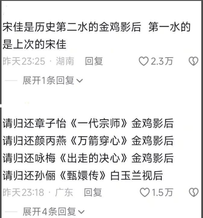 颁奖礼结束仅48小时,“宋佳二封金鸡影后”的话题单日阅读量突破3亿,评论区俨然成了舆论战场。有人翻出十二年前的旧账,吐槽她2012年凭《悬崖》击败孙俪摘得白玉兰视后“名不副实”;有人重提2013年她凭《萧红》力压章子怡《一代宗师》、颜丙燕《万箭穿心》的争议,称她是“爆冷专业户”;更有人将矛头指向评审机制,结合她正在拍摄张艺谋新片《惊蛰无声》的背景,抛出“评委给自家演员颁奖”的质疑。一场关于专业与公平的辩论,在网络上迅速发酵。